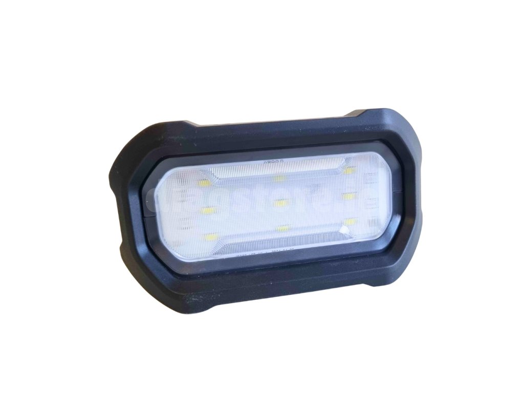 • Flashlight with 400 lumens (static, warning, strobe, and SOS modes) and a stand for adjusting the direction.