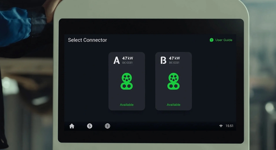 Autel MaxiCharger DC Compact is a DC fast charging station for electric vehicles. It allows connection of up to 2 vehicles. It has a power output of 47 kW and can generate a range of approximately 130 km/30 min. Using dynamic load balancing (DLB), the fast charger can charge 2 vehicles simultaneously and dynamically share the energy between them. The charging station also features a 21.5" LCD display with IK10 protection, which can be used for monitoring charging data and switching languages as well as an advertising area. It is ideal for electric vehicle fleets, dealerships, shopping malls, parking lot owners etc. The fast charging station supports credit card reader, RFID and pay by through the app. It is also ready for plug-and-charge function.