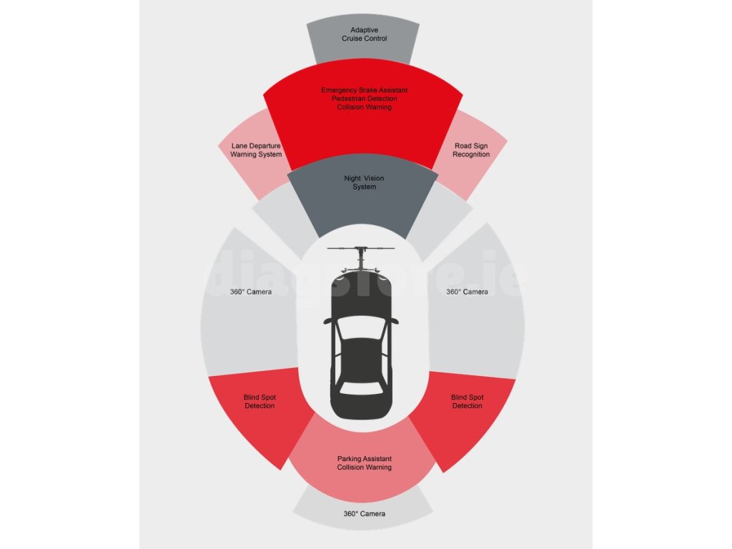 - Emergency Braking Assist, Pedestrian Detection, Collision Warning
